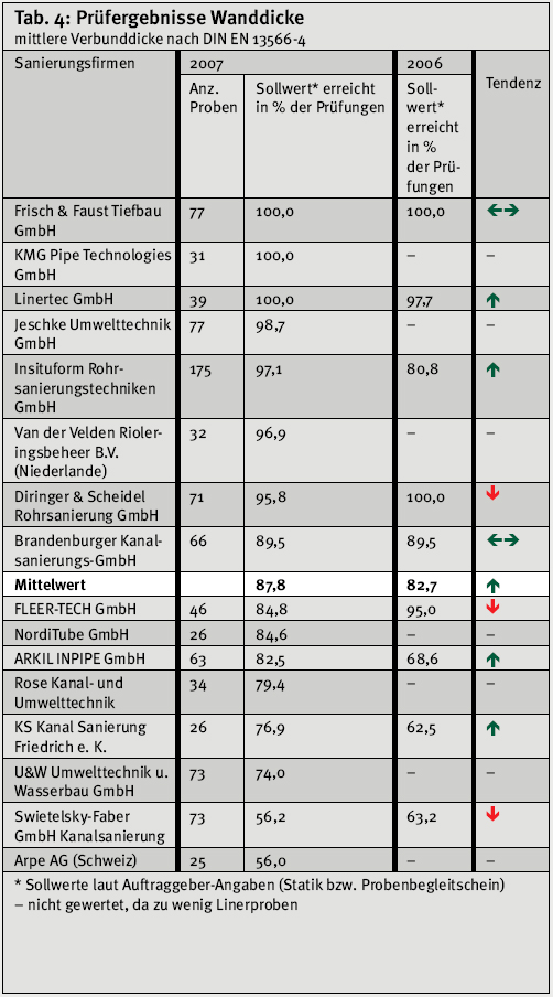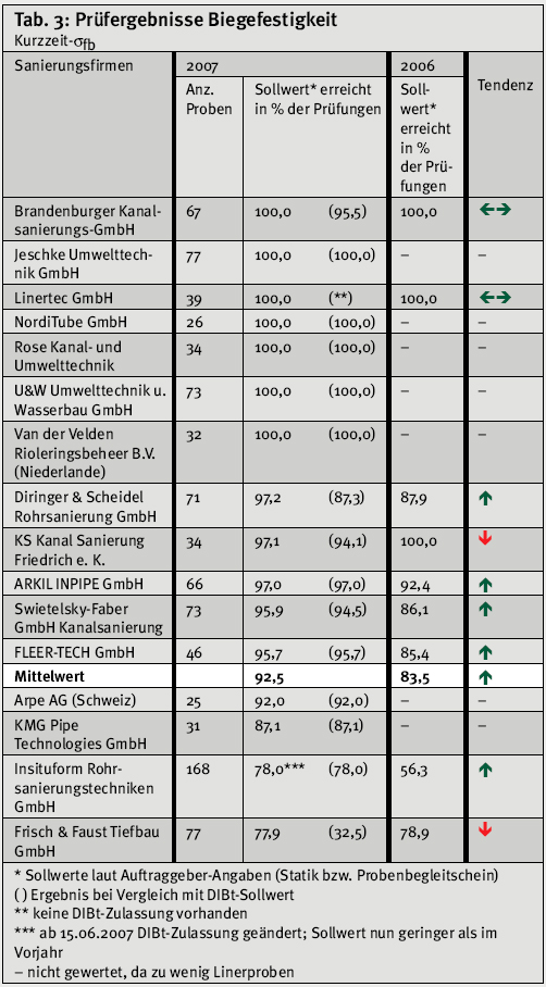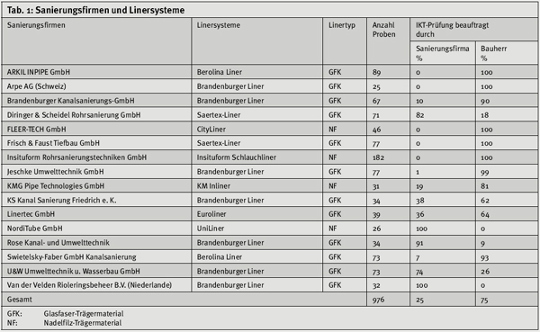 Datenbasis Der IKT-LinerReport 2007 umfasst den Prüfzeitraum Januar bis Dezember 2007 und beruht auf insgesamt knapp 1.000 Baustellenproben. Erstmals fließen nicht nur Ergebnisse aus Deutschland, sondern auch aus dem europäischen Ausland ein – bei gleichen Prüfstandards für alle. Um statistische Ausreißer zu vermeiden, sind nur Sanierungsfirmen berücksichtigt, für die mindestens 25 Linerproben von fünf verschiedenen Baustellen vorliegen. Im Berichtszeitraum erfüllen 16 Sanierungsfirmen (siehe Tab. 1) diese Mindestanforderung, fünf mehr als im Vorjahr. Bei Wiederholungsprüfungen gilt das zuletzt festgestellte Ergebnis, sofern diese Prüfungen ebenfalls im IKT stattfanden. | ||||||||