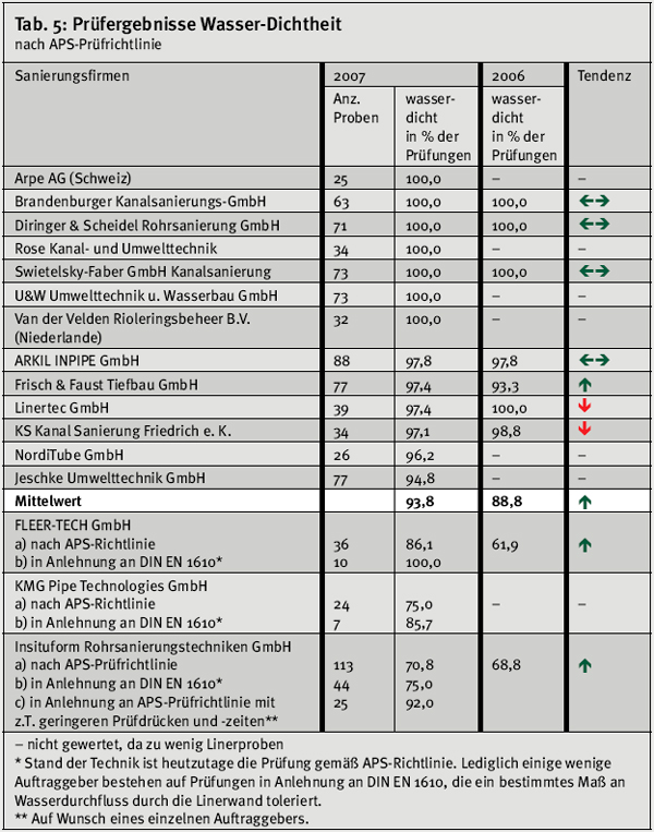 Wanddicke und Wasser-Dichtheit Wanddicken-Sollwerte werden anhand statischer Berechnungen festgelegt oder vom Auftraggeber vorgegeben. Die Eigenschaft Wasserdichtheit wird heutzutage nach der APS-Prüfrichtlinie (vgl. www.ikt.de) bestimmt. Dabei lautet das Resultat entweder „dicht“ oder „undicht“ (Ergebnisse siehe Tab. 5). | ||||||||