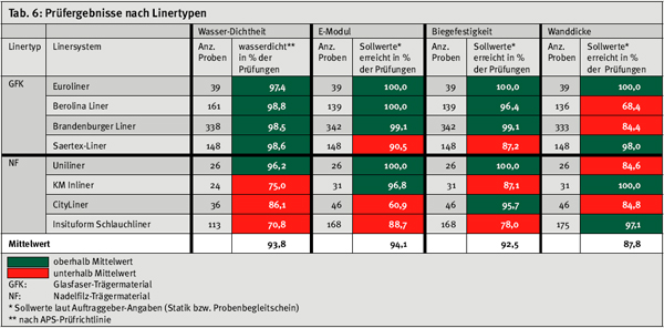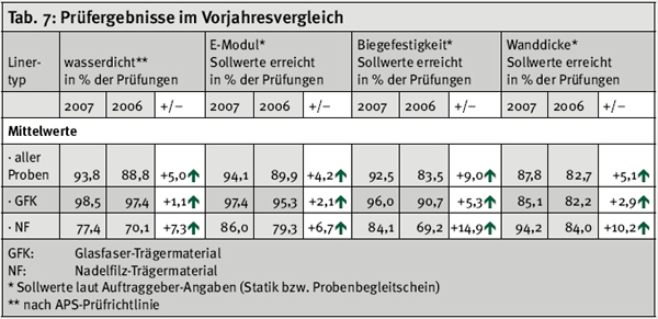 Gesamtbild der Prüfergebnisse 2007 Aus den Prüfergebnissen 2007 ergibt sich ein insgesamt positiveres Bild als im Vorjahr. Bei allen vier Prüfkriterien erhöhen sich die Mittelwerte über alle Proben um beachtliche 4 bis 9 Prozentpunkte (siehe Tab. 7). Einen regelrechten Sprung nach vorne macht die Gruppe der Nadelfilz-Liner. Ihre Mittelwerte verbessern sich um rund 7 bis 15 Prozentpunkte, bleiben jedoch bei Wasser-Dichtheit, E-Modul und Biegefestigkeit unter den Gesamtmittelwerten. Lediglich bei der Wanddicke sind sie deutlich überdurchschnittlich. Auch die GFK-Liner verbessern sich im Durchschnitt, jedoch sind die Steigerungen hier deutlich bescheidener als bei den Nadelfilz-Linern, wenngleich von einem höheren Ausgangsniveau. Sorgenkind bleibt wie in den Vorjahren die Wanddicke, die unter dem Gesamtdurchschnitt liegt. Allerdings offenbart ein Blick auf die Einzelergebnisse (siehe Tab. 2 bis 5) z.T. sehr divergierende Leistungen der Sanierer. Manche Leistung wurde besser, andere schlechter als im Vorjahr. Gleiches gilt für die Aufschlüsselung nach Linertypen (siehe Tab. 6)